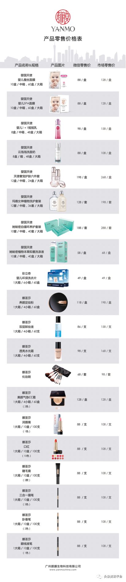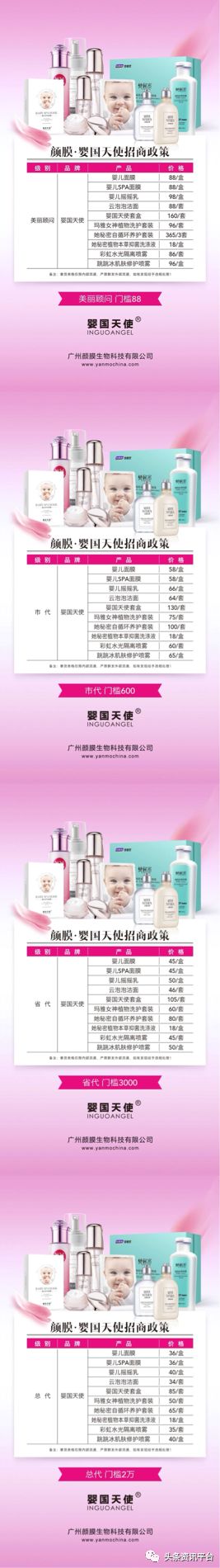 前文提到颜膜的产品主要有婴国天使、TGTG药妆、娜圣莎彩妆这三种,其中婴国天使主打美容护肤,植物洗护,TGTG主要针对药妆产品,而娜圣莎负责彩妆市场,这三种产品都有其各自的代理制度,下面我们来一个一个说。