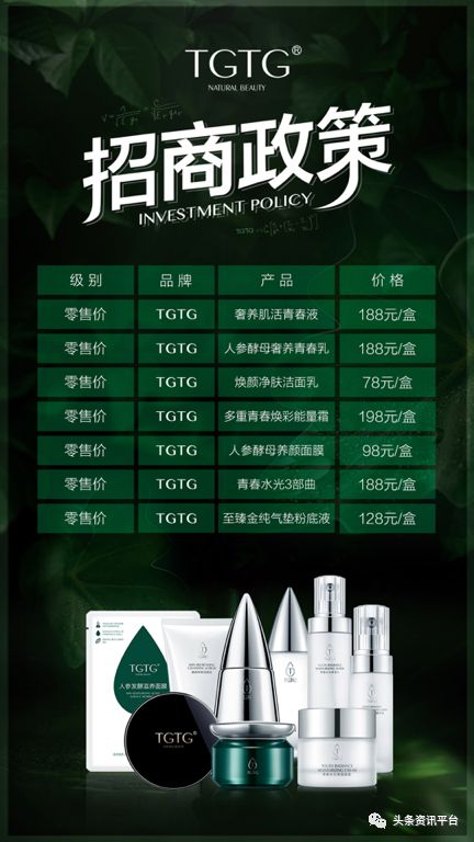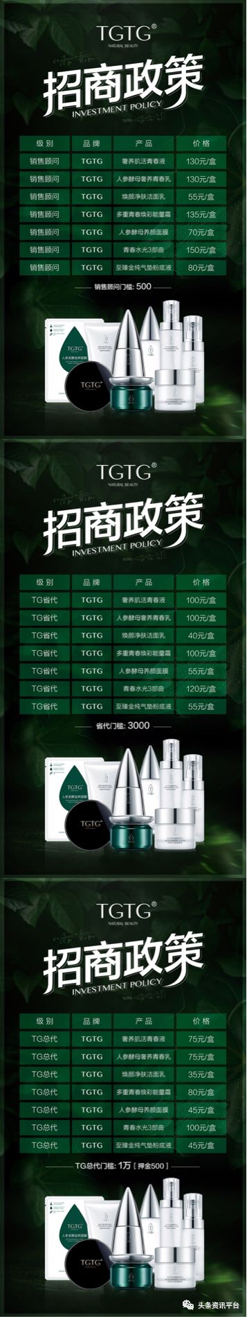 TGTG药妆系列分为销售顾问、省代和总代,其中销售顾问相当于市代,它和娜圣莎的总代都需要交500的押金。