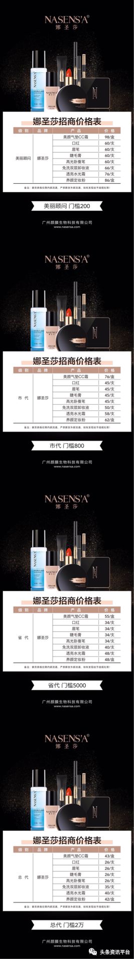 通过以上不同代理等级的拿货价格表和零售价格表不难看出,等级越高,拿货价越低,再对比零售价,一些单品的利润甚至高达一百,其中的收益肉眼可见。并且代理享受公司的平移政策,只要成为三种系列产品中任意一种的代理,便自动成为另外两种产品的同级代理。