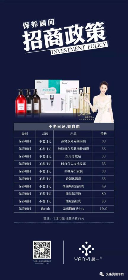 颜一生物科技有限公司推出的颜一系列产品是黄小斌自颜膜推出的第二大美容类产品,公司提出只需99元即可获得原价384元的三盒面膜,成为保养顾问,并且附赠个人专属线上商铺一家,分享店铺二维码就能赚钱,无需囤货。以下是保养顾问拿货的价格表: