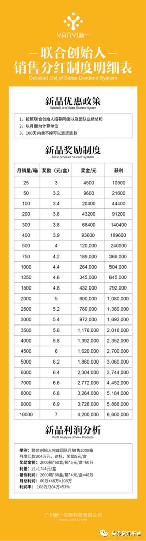 公司的销售奖励主要是针对总代和联合创始人招募同级以及所在的团队业绩总和来统计。以一个月为单位,根据这个月卖出的产品箱数作为月销售量,以卖出的每盒产品为奖励单价,每箱60盒进行计算。再加上销售的差价利润成为一个月的总利润。