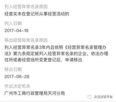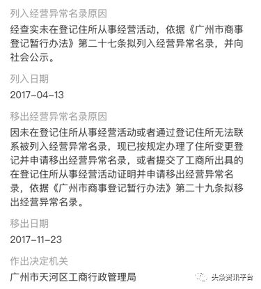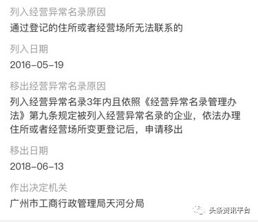 然而紧接着,广州颜膜生物科技有限公司因登记住所无法联系也被列入经营异常名单,于2018年移出。