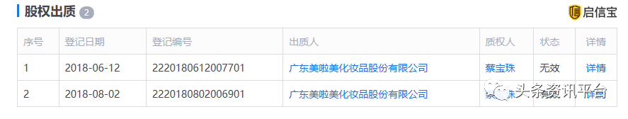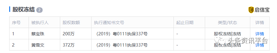 据启信宝显示,目前,蔡宝珠的股权数额200万和黄雪文的股权数额372万都处于股权冻结的状态。