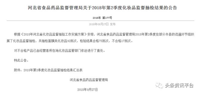 2018年9月27日,河北食药监发布《河北省食品药品监督管理局关于2018年第2季度化妆品监督抽检结果的公告》,通报显示本次共抽检面膜类化妆品92批次,检验结果合格75批次,不合格17批次。不合格产品标示生产企业的名单中就有广州花肌粹化妆品有限公司的名字,不合格的产品为美肌颜绿茶活颜清痘面膜、美肌颜小绿盒花萃水悦丝滑面膜、美肌颜洋甘菊水润修护面膜。