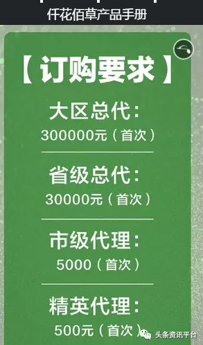 据悉,仟花佰草品牌的产品零售75元,一般卖会员价99元三盒,500元是精英代理,5000元是市级代理,3万元是省级代理,30万元是大区总代。