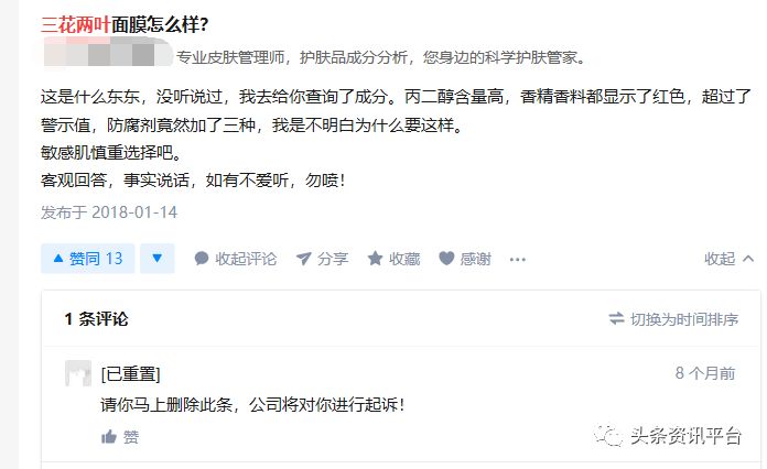 关于三花两叶的面膜,在知乎上有网友表示“丙二醇含量高,香精香料都显示了红色,超过了警示值,防腐剂竟然加了三种,我是不明白为什么要这样,敏感肌慎重选择吧。”然后,有另一位网友回复称“请你马上删除此条,公司将对你进行起诉!”、“我是三花两叶官方运营商,希望你们不要传播一些诋毁我们品牌的谣言,否则公司将对你们进行起诉!”