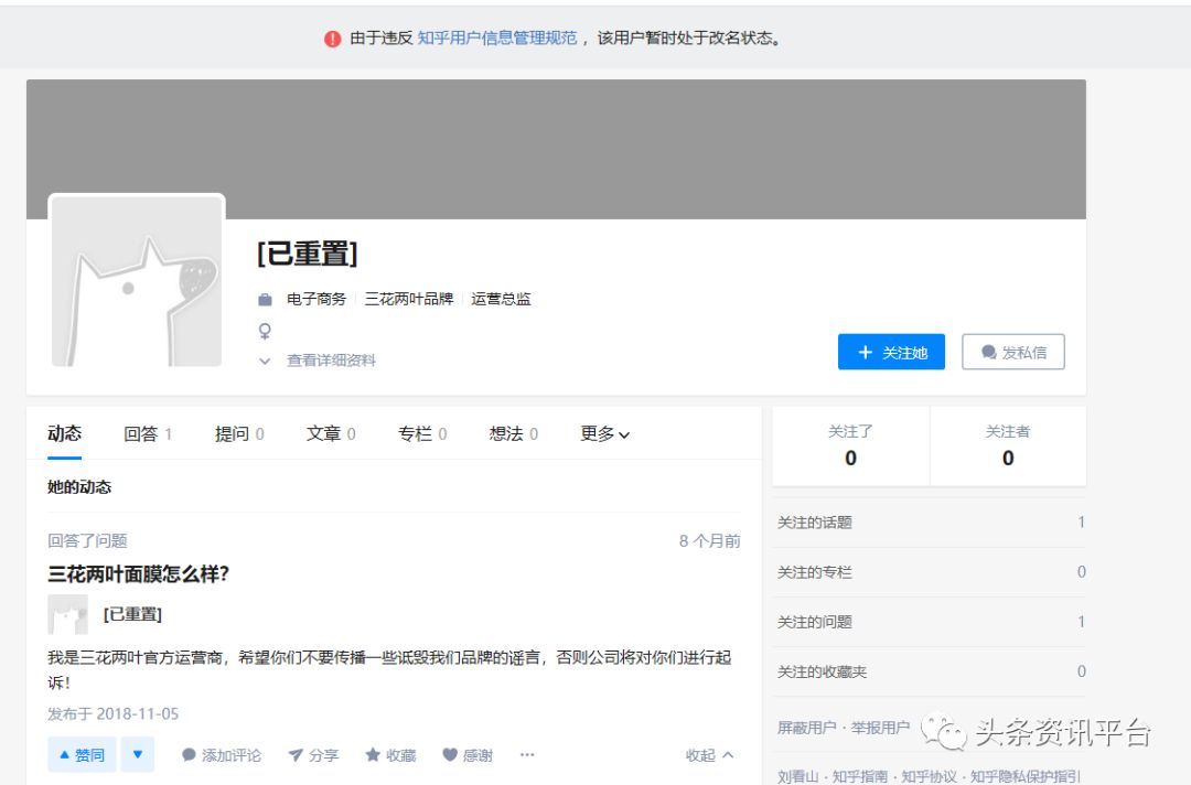 然而,截止目前,那位网友仍然没有把答案删除,反而是这位在个人简介中写到“三花两叶品牌运营总监”的用户,由于违反知乎用户信息管理规范,暂时处于改名状态。