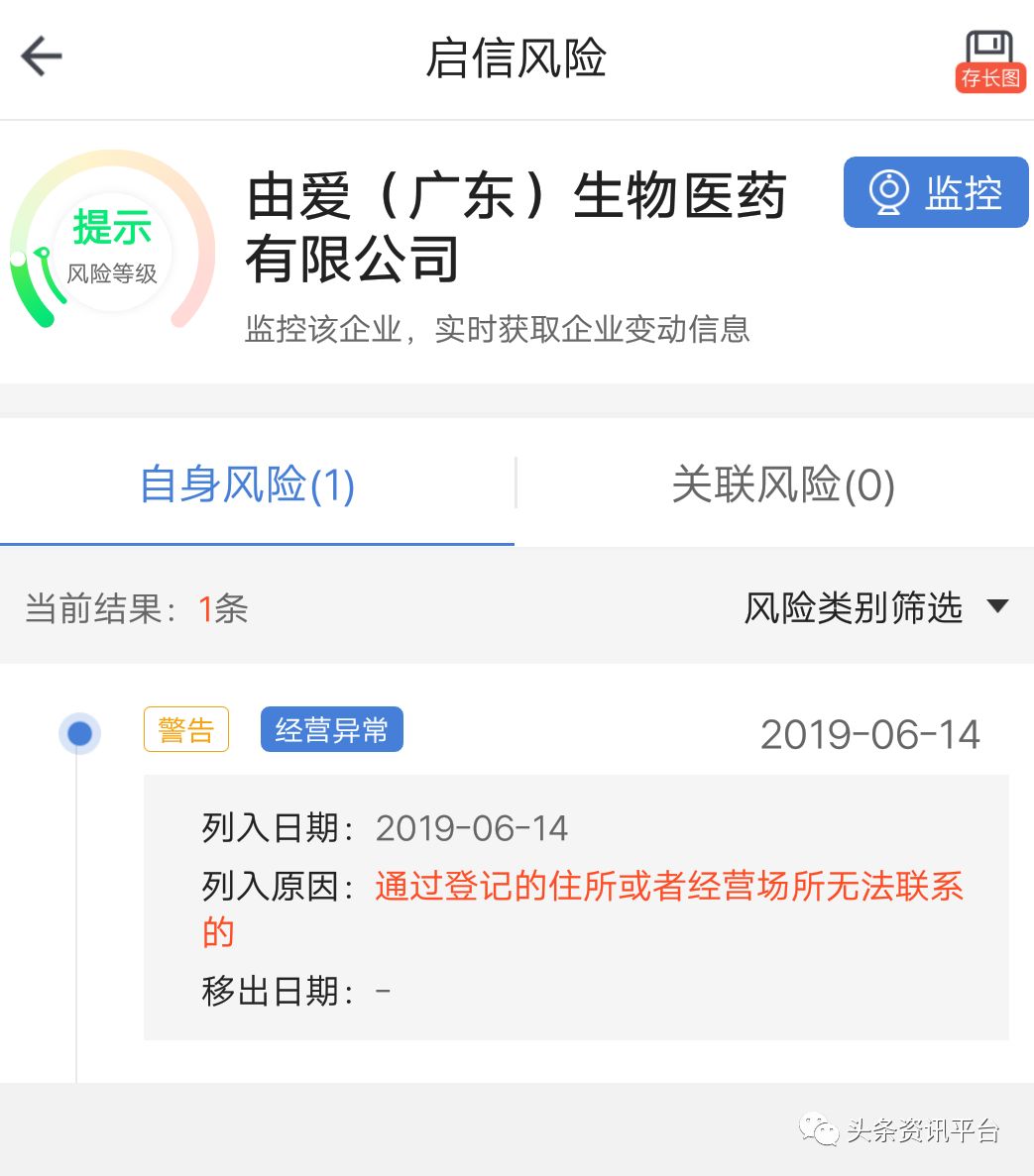经查,由爱(广东)生物医药有限公司于2018年9月份成立,注册资本1000万元,实缴0元,在今年的6月份,还因为通过登记的住所或者经营场所无法联系的原因,被列入了经营异常的名单,至今还未被移出。