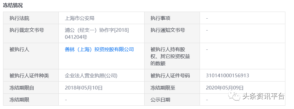 另据启信宝显示,北京豪钥科技股份有限公司还有一条由上海市公安局执行的股权冻结信息,被执行人是善林(上海)投资控股有限公司,这家公司是豪钥科技的法人股东之一。