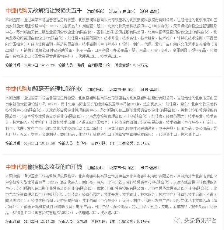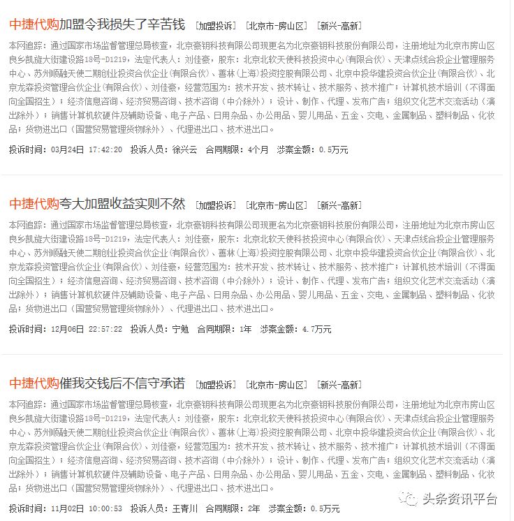 但就是这样一家背景堪称雄厚的企业,却在近几年来因为中捷代购这个项目屡陷投诉漩涡。不但在中顾法律网上,有不少质疑中捷代购的声音,在“财经全搜索”和“中诉网”等网站上,也有标题分别为“中捷代购加盟毫无道理扣我的款”、“中捷代购夸大加盟收益实则不然”等多篇投诉文章。