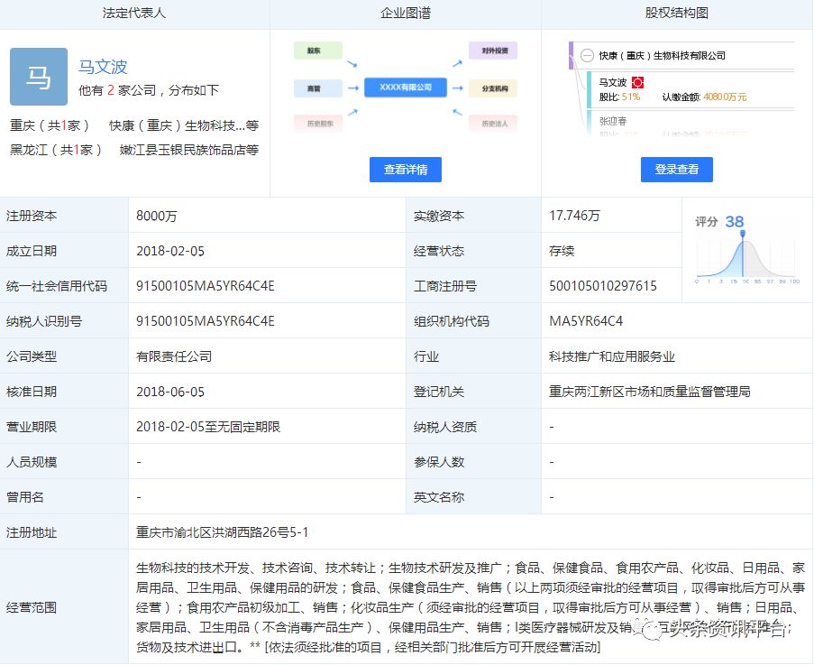 据天眼查显示,快康(重庆)生物科技有限公司成立于2018年2月5日,法人代表马文波,股东马文波、张迎春,二人关系为夫妻关系,注册资金8000万元,实缴资金17.746万元,其中马文波出资17万元,张迎春出资0.746万元。