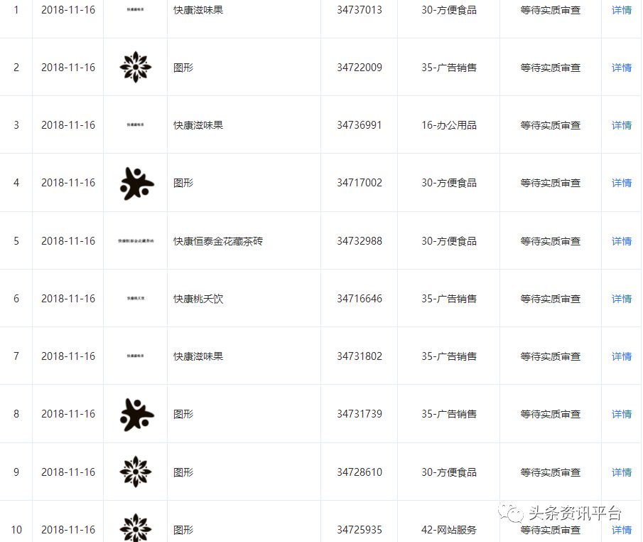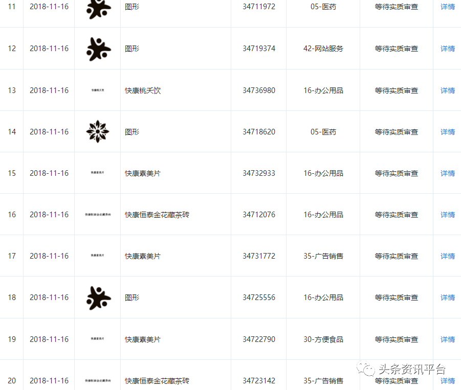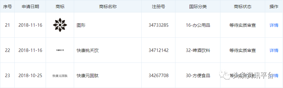 在天眼查中,笔者发现快康一共注册商标23个,全部处于等待实质审查状态中,在这些注册的商标中,没有快康饮的身影。