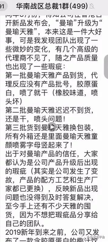 大会后,小刘还声称,“有一些没去大会现场的代理收到所谓升级版的曼瑜天雅后发现用了跟之前的曼瑜差别很大,原来的曼瑜喷上后会有一层胶原蛋白覆盖、有一点点黏感,并且是甜味的,而曼瑜天雅没有,并且保湿效果大不如前。”