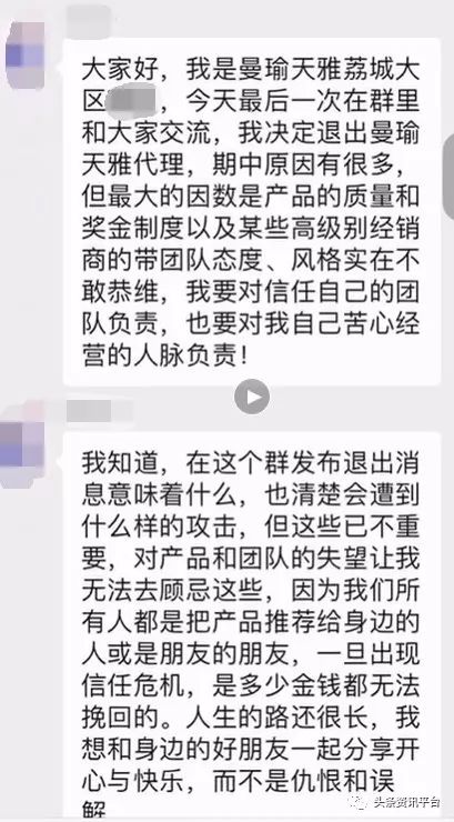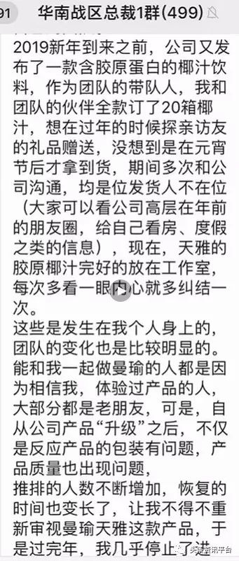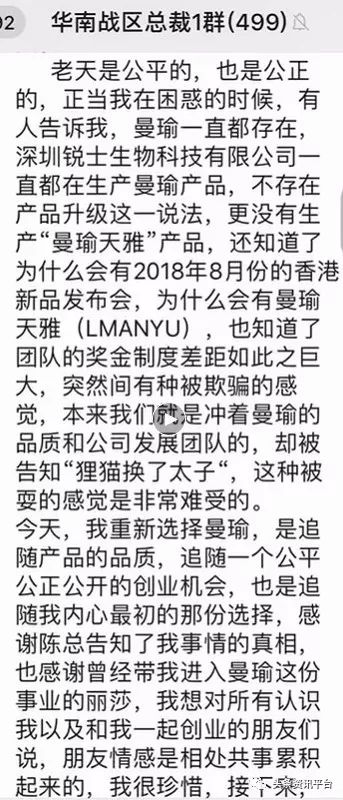 而就在当时,有一些比较大的团队长发现不对劲,因为之前公司没有透露半个字,于是有认识幕后老板陈鸿昇的代理当天大会没结束就去找到陈鸿昇了解情况,躺在病床上的陈鸿昇还不知道发生了什么,也不相信谢杭峰夫妇会这么做,而且在大会前谢杭峰就找了其他工厂,生产了一批曼瑜天雅。