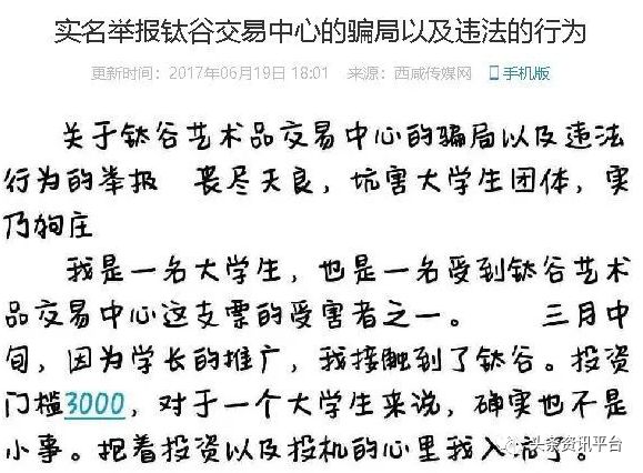 但相较于在网上人们对钛谷交易中心的议论,关于钛谷文化西谷文交所的骂声更为甚之。2017年6月,在西咸传媒网上,有网友以受骗者的身份发表文章《实名举报钛谷交易中心的骗局以及违法的行为》。