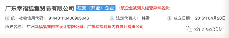 早在2015年04月20日成立了广东幸福狐狸内衣设计有限公司,后来公司名字变更为广东幸福狐狸贸易有限公司;在国家企业信用信息公示系统中查到广东幸福狐狸贸易有限公司被列入经营异常名录,以下四种情况是公司会被列入经营异常名录:一、未按规定报送年度报告的企业;二、未按规定履行即时信息公示义务的企业;三、公示企业信息隐瞒真实情况、弄虚作假的;四、失联的企业。也就是幸福狐狸在早期经营过程中是有问题。