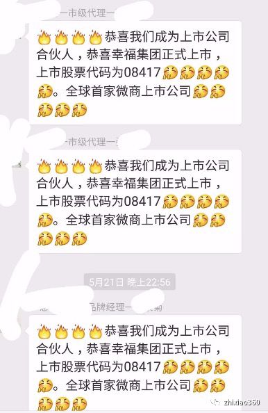 微信群里其大量的代理商宣传公司上市代码是08417,而08417并非是幸福狐狸,而是在香港上市“大地教育”,如此虚假宣传、炒作原始股毫无底线的做法只为拉更多代理加入幸福狐狸,不断的发展其下线代理;幸福狐狸曾在深圳前海股权交易中心挂牌,而非上市,这样的举措也被偷换概念说是企业上市。
