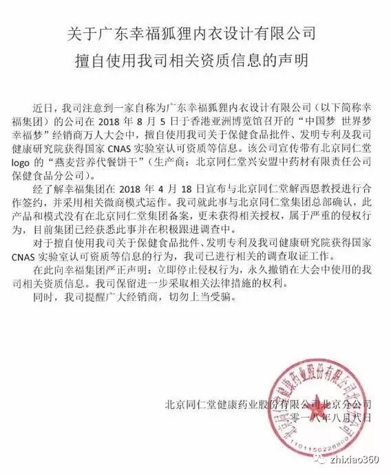 8月8日,北京同仁堂健康药业股份有限公司北京分公司(下简称:同仁堂北京分公司)发布一则《关于广东幸福狐狸内衣设计有限公司擅自使用我司相关资质信息的声明》,声明称幸福集团在2018年8月5日于香港亚洲博览馆召开的“中国梦 世界梦 幸福梦”经销商万人大会中,擅自使用同仁堂北京公司关于保健食品批件、发明专利以及同仁堂健康研究院获得国家CNAS实验室认可资质等信息,并且宣传带有北京同仁堂logo的“燕麦营养代餐饼干”。