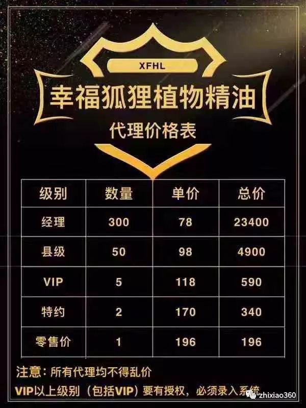 幸福植物精油在市场的代理制度有四级,分别是:特约、vip、县级和经理,而实质上隐藏了上面三个级别的大代理,分别是:金钻、总裁以及分公司,零售价是196元/盒,不同级别的拿货价格也不一样,特约拿货价170元/盒,VIP拿货价118元/盒,县级98元/盒,品牌经理拿货价78元/盒等,金钻拿货价63元/盒,总裁拿货价48元/盒;想要升到上面最高的三个等级分别还需要直推和间接推荐;