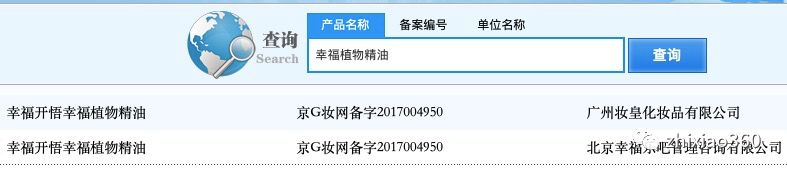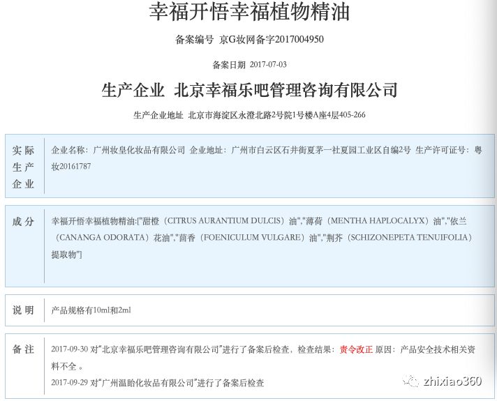在国家食品药品监督管理总局查到:幸福开悟幸福植物精油是属于广州妆皇化妆品有限公司,并不是属于幸福集团,幸福开悟幸福植物精油在国家食品药品监督管理总局备案中显示成分只有几种植物的提取物,并且规格有10ml和2ml,而幸福集团旗下的幸福植物精油是30ml的规格,并号称是20多种中草药提取而成,也就是说属于幸福集团旗下幸福植物精油并没有在国家食药监中查到有备案。