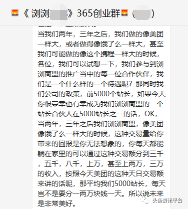 “当我们两年,三年之后,我们做得像美团一样大,做得像饿了么一样大,甚至我们可能做得像携程一样大的时候,各位,我们可以试想一下,我们参与到浏浏商盟推广当中的每一位合作伙伴,我们是一个什么样的待遇呢?如果今天你很荣幸也有幸成为我们浏浏商盟的一个站长合伙人、在5000名站长之一的话,当两年、三年之后,我们浏浏商盟像美团、像饿了么一样大的时候,这种交易量给你带来的回报是你无法想象的,你每天都能躺在家里地通过这种交易额分到三千,五千,八千,上万,甚至上两万,三万的收入,按照今天美团的这种日交易额来讲的话,那我们5000名站长,每天岂不是要分一两万块钱。”