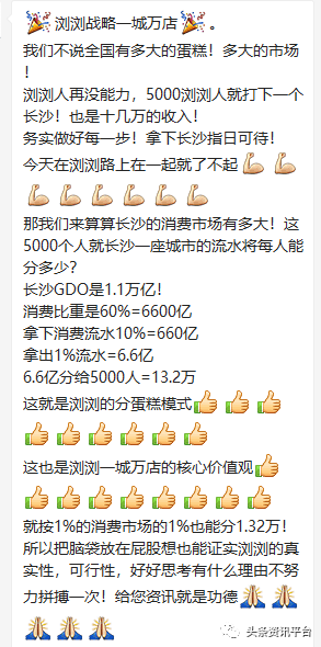 而要将“5000名站长每天要分一两万块钱”的说法倒推回去的话,得出的结果是浏浏商盟的年收入将在一万八千亿到三万六千亿之间,这个夸张的数字甚至已经远超他们自己所罗列出来的长沙市一万一千亿的GDP了。