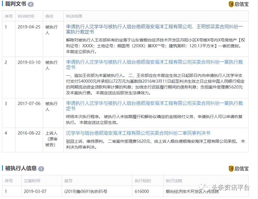 2019年,由王名邯担任实控人的烟台德顺海安海洋工程有限公司也因买卖合同纠纷沦为被执行人,山东省烟台经济技术开发区人民法院在2017年2月向被执行人送达执行通知书,责令其向申请执行人支付72万元并承担以72万元为基数的同期流动资金贷款利率计算的利息;加倍支付迟延履行期间的债务利息;负担案件受理费5620元及本案执行费。但被执行人依然未履行生效法律文书确定的义务。
