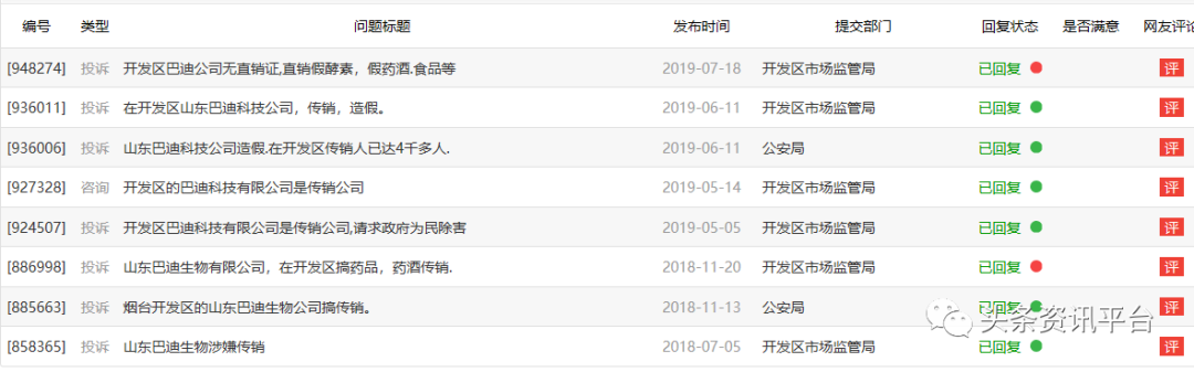 在烟台政府部门和窗口单位在线为群众答复疑问、解决疑难问题的网站——“烟台网上民声”上,通过搜索关键词“巴迪”,我们发现有关该公司的举报记录达八条之多。