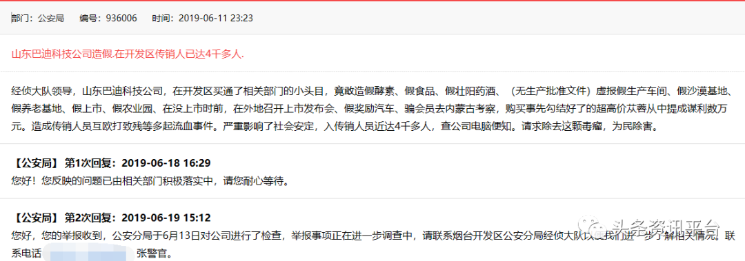 6月11日,又有网友在该网站上发表投诉信息,称“巴迪公司造假,在开发区涉及传销人数已达4000”。对此,公安分局回应称,已于6月13日对公司进行了检查,举报事项正在进一步调查中。