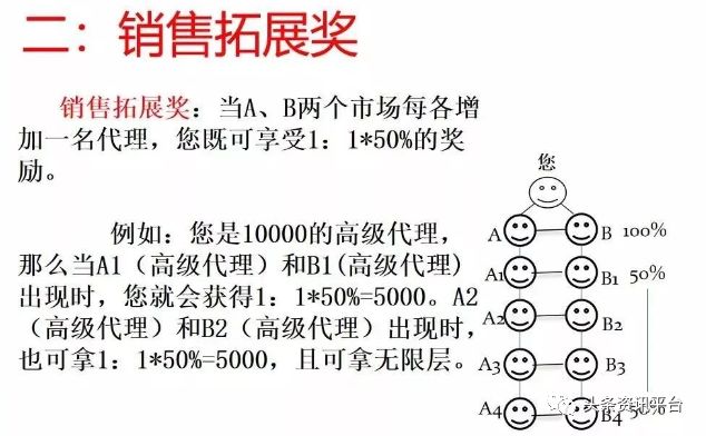 二,销售拓展奖,从第二层开始,无论是谁推荐的在出现两个代理商时,公司会返还50%,也就是3500元的现金,且这笔奖金无限层。