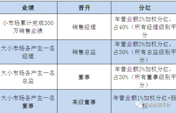 七,领导奖,当您业绩累计达到300万不但奖励别墅,同时您也晋升为经理,也会得到公司全年营业额2%当中的40%加权分红;当您左右两区各有一个经理的时候,您就可成为总监,享受全年营业额2%当中的另30%加权分红;当您左右区出现一个总监时,您就可以成为董事。