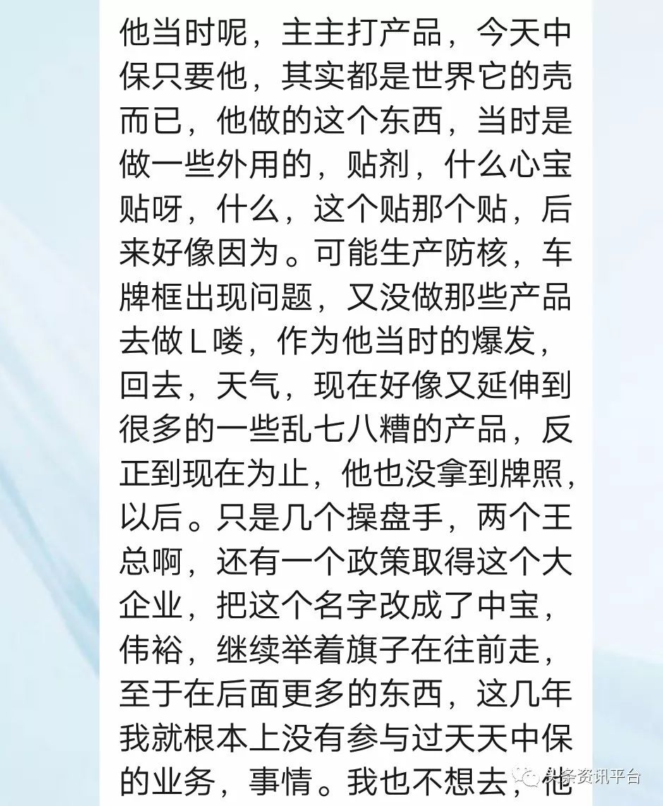 据悉,天津中宝于2003年5月成立,最初的名字为天津市中宝科技有限公司,之后改名为天津市中宝制药有限公司。2004年,中宝制药被天津兆士科技发展有限公司收购,并成为其旗下子公司。2012年夏天,中宝制药直销板块正式起盘,程龙操盘,于宝哲和陈欣雨作为最大系统领导人开始招商,另外一支团队的带头人是天津本地的一个大姐。2015年10月14日,宣传以直销模式运作市场的天津中宝伟裕科技有限公司成立。到了两年后的2017年9月,它的名字又变为了天津市伟裕天成健康管理有限责任公司。