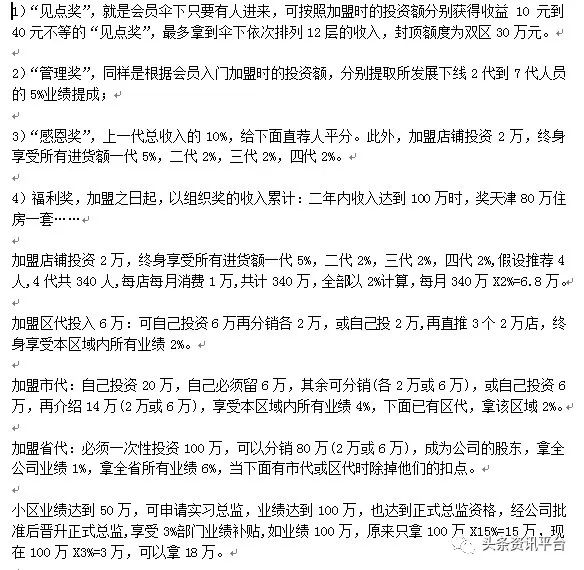 据悉,“天津中宝直销”的会员分为银卡、金卡、钻卡,分别需投入2001元、4002元、8004元,业绩提成按照投资额的大小,周封顶收益可达8万。