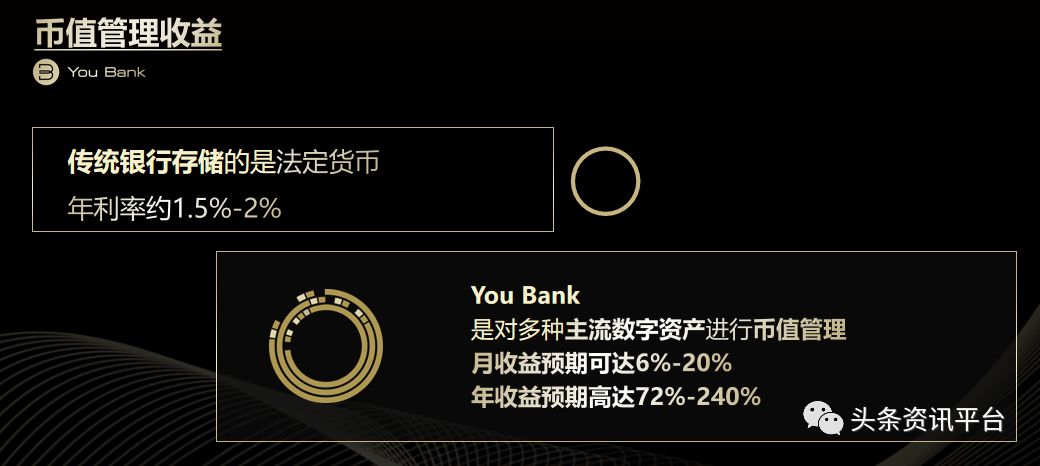 “YouBank钱包,一款保本并且月息高达6%到20%的产品。操作起来甚至比P2P还简单,先将虚拟币存到app账户里,再开启静态分红模式,然后每天打开钱包看着资产涨涨涨就可以了。只要在YouBank平台存入价值510美金的数字货币,不但有静态收益,如果发展其他人加入还有十四代的动态收益,发展得越多,收益也就越多。”