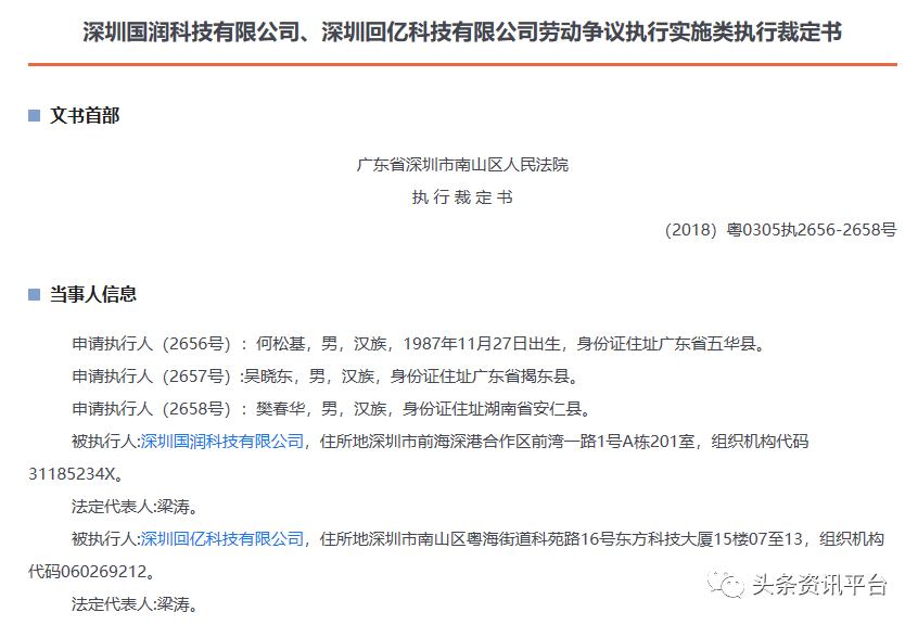 调查还发现,有关深圳回亿科技有限公司的立案信息多达27条,另外一个与之关联的深圳国润科技有限公司(原名深圳特奢汇科技有限公司)也没能出淤泥而不染,2018年,这两家公司因劳动争议被划入到广东省深圳市南山区人民法院公示的被执行人名单,冻结资产43万元,但此后这两家企业仍拒不履行法律义务,最后被法院采取强制执行措施。