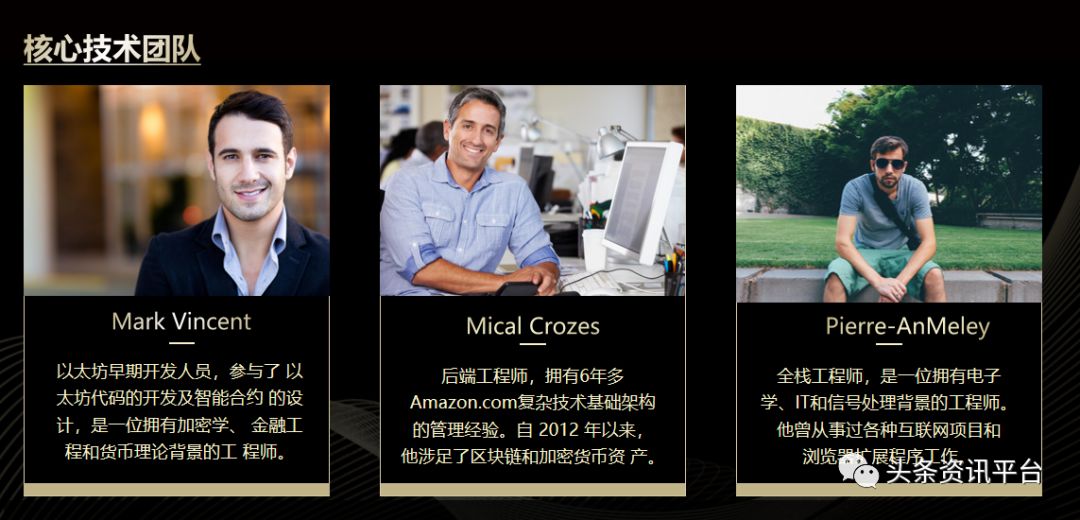 下面,我们再来看看联手打造出YouBank这个项目的“三巨头”。据其官网显示,其核心技术团队共有Mical Crozes、Pierre-AnMeley和Mark vincent等三人,并附上了照片。