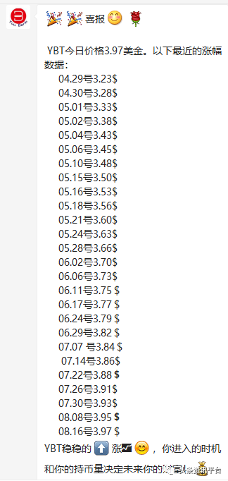但在当下,YBT还根本无法提现及充值,只能通过站内转账的方式进行操作。完全可以说就是普通的积分,甚至连到底有没有这个代币,很多参与其中的玩家都无法确定。别忘了,在去年的此时此刻,正是俞凌雄和王金疯狂敛财的时候,幸孕链、万象币、黄金币、菠菜币、车链等都还留有他们挥舞着镰刀进行收割的痕迹,一个月孕育一个币种,一个币种敛财数亿……