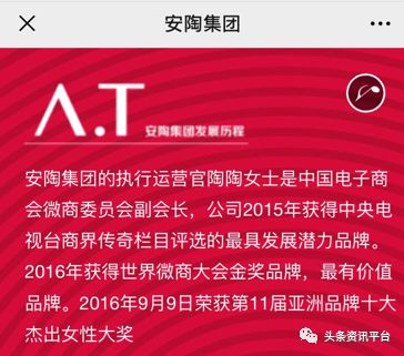 而作为安陶集团的董事长,关于陶陶的一系列荣誉也是非常多。其中在公司官网上显示的陶陶是中国电子商会微商委员会的副会长,然而经过笔者调查却并没有看到有关陶陶的字眼。
