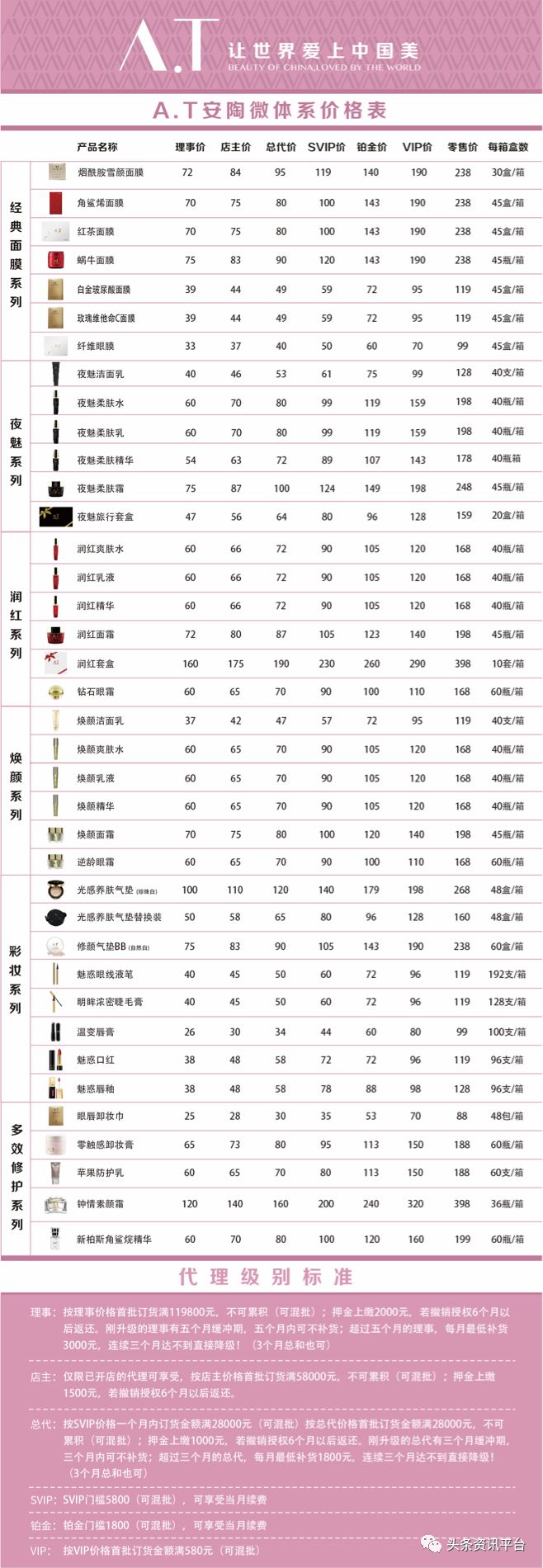 首先是A.T化妆品品牌,代理一共分为VIP、铂金、SVIP(特邀)、总代、店主、理事和官方七个级别。其中店主属于隐藏级别,即使不开店也可以拿店主的级别,官方级别还要通过公司的考核,需要有自己的团队,并且做化妆品品牌还可以平移做氧仙子和纤喜美。具体的代理价格表如下: