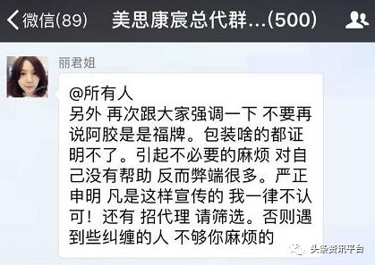几乎同一时期,有网友在“揭秘骗局网”上爆料,“2018年2月23日,我从群里看到以下图片里的通知——强调不能宣称是福牌的,我一下子懵了,不敢再自欺欺人,要求对方退货,对方口口声声辩称东西没有问题,这个通知是因为美思康宸要委托生产冠名包装的阿胶,所以不再声称福牌。对方执意不退款,还把我拉黑了。”