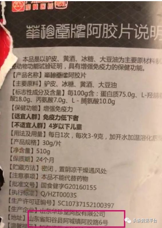 经查该产品外包装,我们发现其生产厂家果然并非福胶集团,而是坐落于阳谷县内的一家企业——山东华珍堂阿胶有限公司。说到阳谷县和这家企业,有阿胶行业从业者透露,“阳谷县跟东阿县不同,在胶块品质把控上,东阿县的健字号品质都要高于外省的OTC国药准字,很多劣质牛皮胶块也都是从阳谷流出来的。”而这一观点也在后文中得到了事实的验证,这里暂且不表。