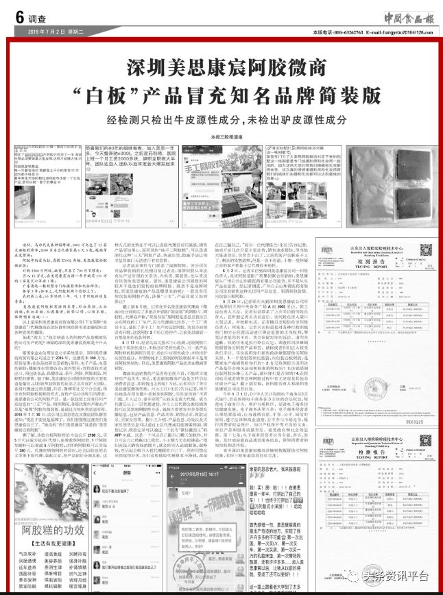 据《中国食品报》报道,经青岛海关技术中心检测,检出牛皮源性成分、骡皮源成分,未检出驴皮源性成分。这说明,美思康宸公司销售的阿胶并不是真阿胶,而是假冒伪劣的阿胶,该款产品阿胶片依然在微商里销售。另一款产品阿胶糕的检测报告显示,检出牛皮源性成分、未检出驴皮源性成分,所谓的纯手工熬制的阿胶糕根本不是用真阿胶熬制的。
