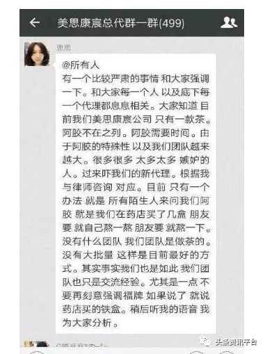 也就是在7月2日这一天,为应对舆论风波,思思在总代群里发言称,“有一个比较严肃的事情和大家强调一下。和大家每一个人以及底下每一个代理都息息相关。大家知道目前我们美思康宸公司只有一款茶。阿胶不在之列。阿胶需要时间。由于阿胶的特殊性以及我们团队越来越大。很多很多太多太多嫉妒的人。过来吓我们的新代理。根据我与律师咨询对应。目前只有一个办法就是,所有陌生人来问我们阿胶就(说)是我们在药店买了几盒,朋友要就自己熬一熬。没有什么团队,我们团队是做茶的。没有大批量这样是目前最好的方式。其实事实我们也是如此,我们团队也只是交流经验。尤其是一点不要再刻意强调福牌,如果说了,就说药店买的铁盒。”