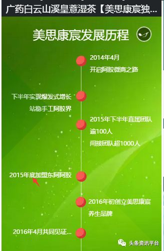 此外,我们在调查过程中还发现了一份由美思康宸署名制作的H5,其介绍称“2015年美思康宸加盟东阿阿胶”,由此可见,这个微商团队挂名阿胶大企进行虚假宣传的行为,很可能并不是只有一次。
