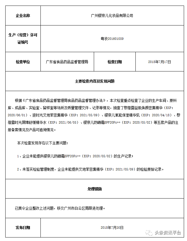 广东省食品药品监督管理局抽查了广州樱奈儿化妆品有限公司五款产品的注册备案情况及产品可追溯情况。抽查发现:黎蓓露时光屏障舒缓精华水(EXP:2021/06/05)未按备案配方组织生产,标签上配方与备案成分不一致;企业也未能提供樱奈儿防晒霜SPF20PA++(EXP:2020/05/02)的生产记录;因未落实检验管理制度,企业也未能提供逆时光艾地苯密集精华(EXP:2021/05/09)的检验原始记录。