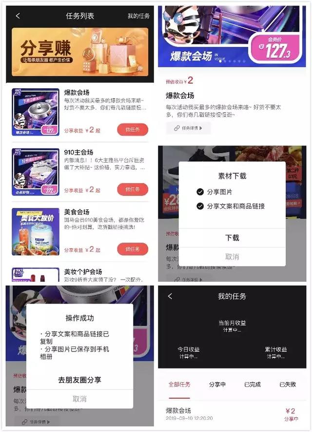 在斑马的App上,上线了一个做任务来赚钱的功能。斑马的会员用户们,只要通过做任务,也就是下载指定的商品素材来发朋友圈,就可以赚取收益。