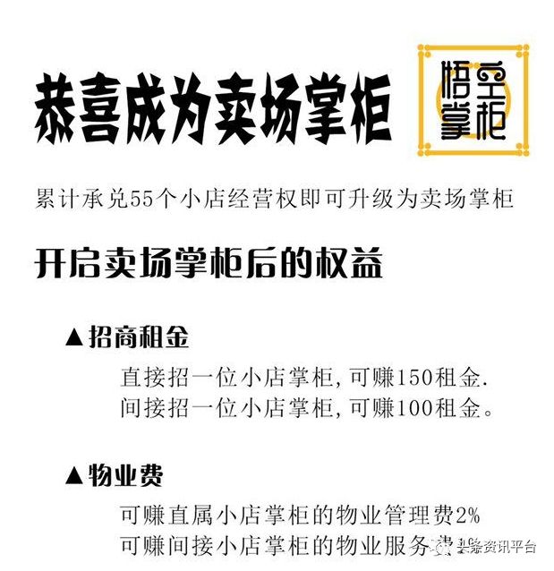 然后是卖场掌柜,升级条件是团队推荐累积55位小店掌柜。直招一位小店掌柜得150元;间接招小店掌柜得100元。物业费收益:第一层2%,第二层1%。