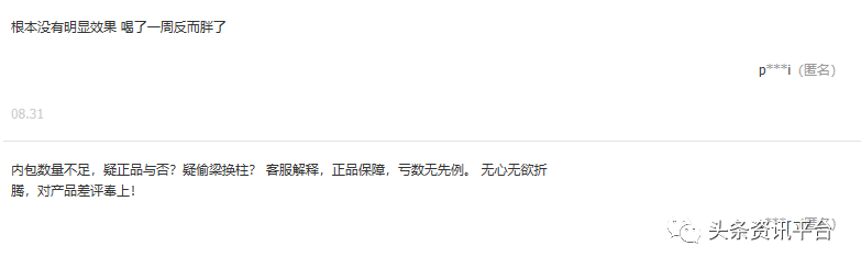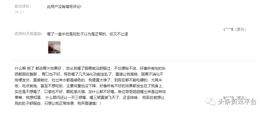 对于蚂蚁农场青汁这款产品,真正的使用者也有话说,在淘宝上,关于其产品的负面反馈不断,“减肥不见效”成了众口一词的消费者评价。