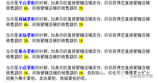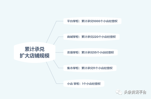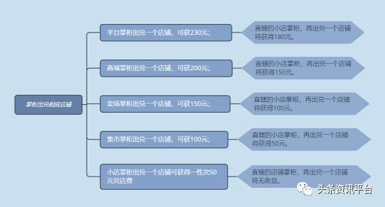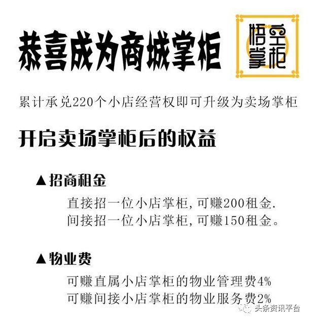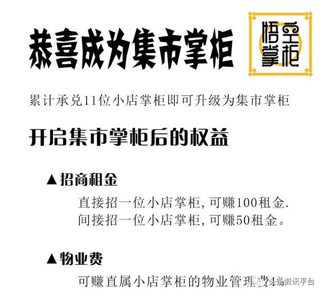 附平台掌柜平级说明:当下面掌柜如累积扩大店铺规模到平台掌柜后,利润为直接推荐的每增加一个店得20元;间接推荐的每增加一个店得10元。上文中的物业管理费特指直接推荐掌柜的线上销售额;物业服务费特指间接推荐掌柜的线上销售额。