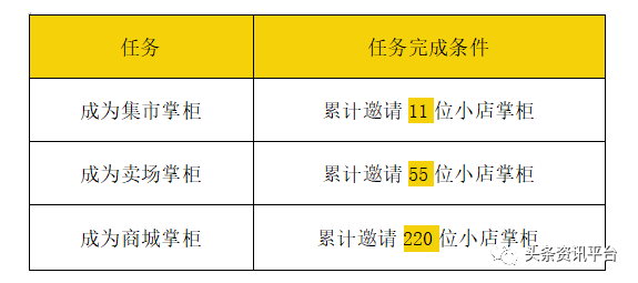 最高级别是平台掌柜,升级条件是团队推荐累积1100位(另有资料称1000位)小店掌柜。直招一位小店掌柜得230元;间接招小店掌柜得180元。物业费收益:第一层4%,第二层2%。